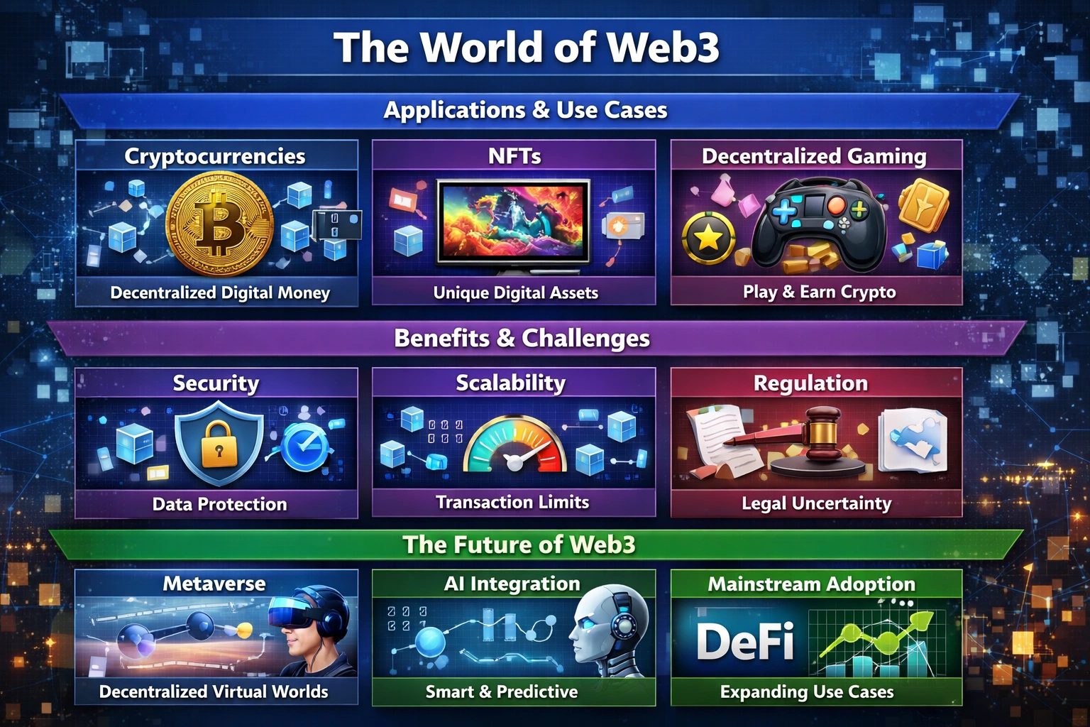 So, what are some of the applications and use cases of Web3? I think it's helpful to start with cryptocurrencies, which are decentralized currencies that use blockchain technology to secure and verify transactions. For example, consider the case of Bitcoin, which was one of the first decentralized currencies to gain widespread adoption. Bitcoin showed that it was possible to build a decentralized network that could be used for financial transactions, and this paved the way for the development of other Web3 technologies. Another important application of Web3 is non-fungible tokens, or NFTs. These are unique digital assets that can be bought, sold, and traded like other commodities. For instance, consider the case of digital art, where artists can create unique digital artworks that can be sold and traded on online marketplaces. With Web3, these types of marketplaces could be built in a decentralized way, so that artists have more control over their own work and can make decisions about how it's used. Gaming is also a big area where Web3 is being applied. I think it's interesting to note that Web3 can be used to create decentralized gaming platforms, where users can play games and interact with each other in a more secure and transparent way. For example, consider the case of decentralized gaming platforms, where users can play games and earn rewards in the form of cryptocurrencies or NFTs.