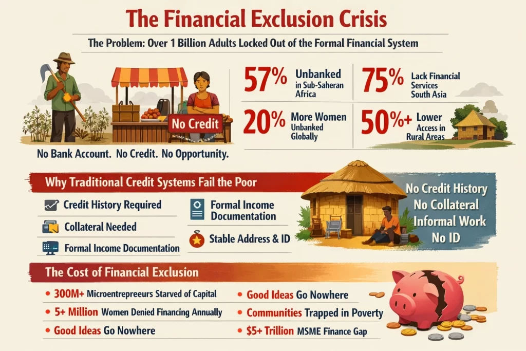 1+ billion adults globally lack access to formal financial services. This isn’t just an inconvenience—it’s a poverty trap. Without access to credit, poor people have no way to invest in their futures. A farmer can’t buy better seeds. A trader can’t expand inventory. A young person can’t start a business. Each generation remains trapped in the same economic circumstances as the previous.