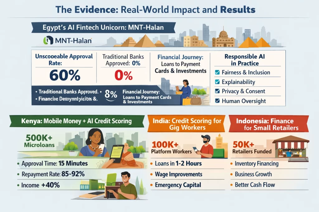 - Halan (Egypt). Documented performance metrics: 65M+ people served; 60% approval rate for previously unscoreable users; automated 50% of loan approvals; full financial journey progression (consumer finance → digital card → investment products); responsible AI principles explicitly implemented including fairness monitoring, explainability, privacy protection, model monitoring, and human oversight.