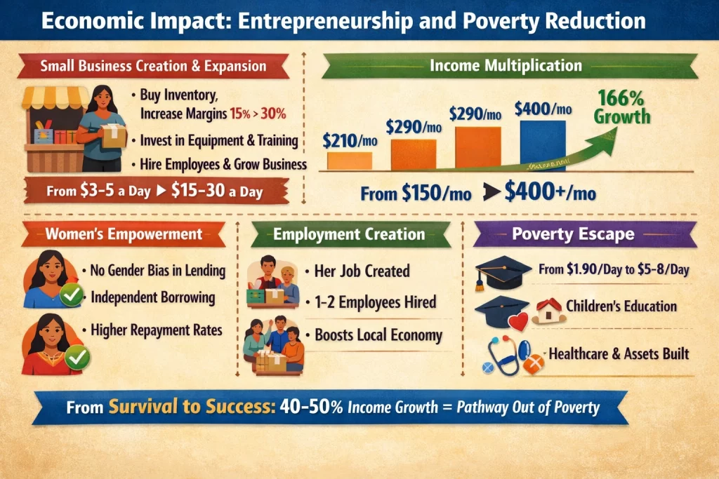 - Employment Creation Through Microenterprise. Studies document that successful microenterprises create 1-2 additional jobs (employees/family members), with multiplier effects through local economy as suppliers gain business from expanded enterprises. Income growth of 40-50% sustained over 3-5 years enables poverty escape and asset building.