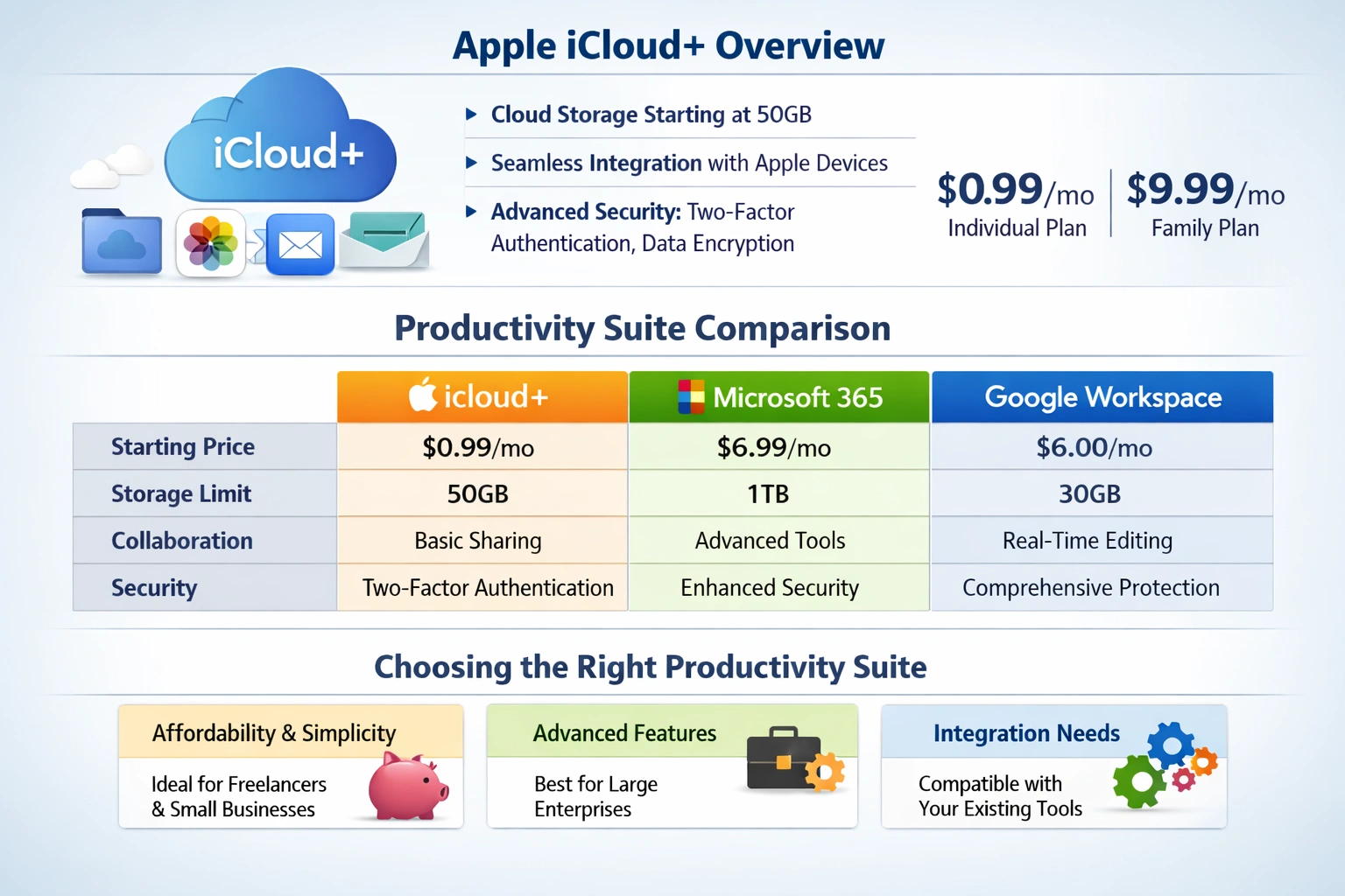 Productivity Suites: Microsoft 365 vs Google Workspace vs Apple iCloud+