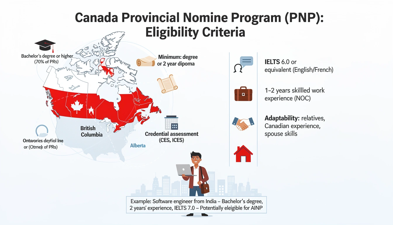 Let's shift gears for a moment. According to a recent report by Immigration, Refugees and Citizenship Canada, over 70% of permanent residents who arrived in Canada through the Provincial Nominee Program (PNP) had a bachelor's degree or higher. This statistic highlights the significance of education in the PNP eligibility criteria. To be eligible for the program, you typically need to demonstrate language proficiency in English or French, with a minimum score of 6.0 in the International English Language Testing System (IELTS) or equivalent. Your education background is also a key factor, with most provinces requiring a minimum of a bachelor's degree or a diploma in a specific field. For instance, the Ontario Immigrant Nominee Program (OINP) requires applicants to have a degree or diploma from a Canadian or foreign institution, with a minimum of two years of study. You can check the specific education requirements for each province on the Immigration, Refugees and Citizenship Canada website. In some cases, you may need to have your foreign education credentials assessed by a recognized credential assessment service, such as Comparative Education Service (CES) or International Credential Evaluation Service (ICES). Work experience is another essential requirement, with most provinces looking for applicants with at least one to two years of experience in a specific occupation or field. For example, the British Columbia Provincial Nominee Program (BC PNP) requires applicants to have a minimum of two years of work experience in a skilled occupation, such as a software engineer or a registered nurse. You can check the National Occupational Classification (NOC) system to determine if your occupation is eligible. Some provinces also offer points for adaptability factors, such as having a spouse or common-law partner with language proficiency or work experience in Canada. For instance, the Alberta Immigrant Nominee Program (AINP) offers points for adaptability factors, such as having a relative in Alberta or having work experience in the province. To illustrate this, consider the case of a software engineer from India who has a bachelor's degree, two years of work experience, and a language proficiency score of 7.0 in IELTS. This individual may be eligible for the AINP, as they meet the education and work experience requirements, and have a strong language proficiency score. You can use the AINP's online eligibility assessment tool to determine your eligibility and get an idea of your chances of being nominated.
