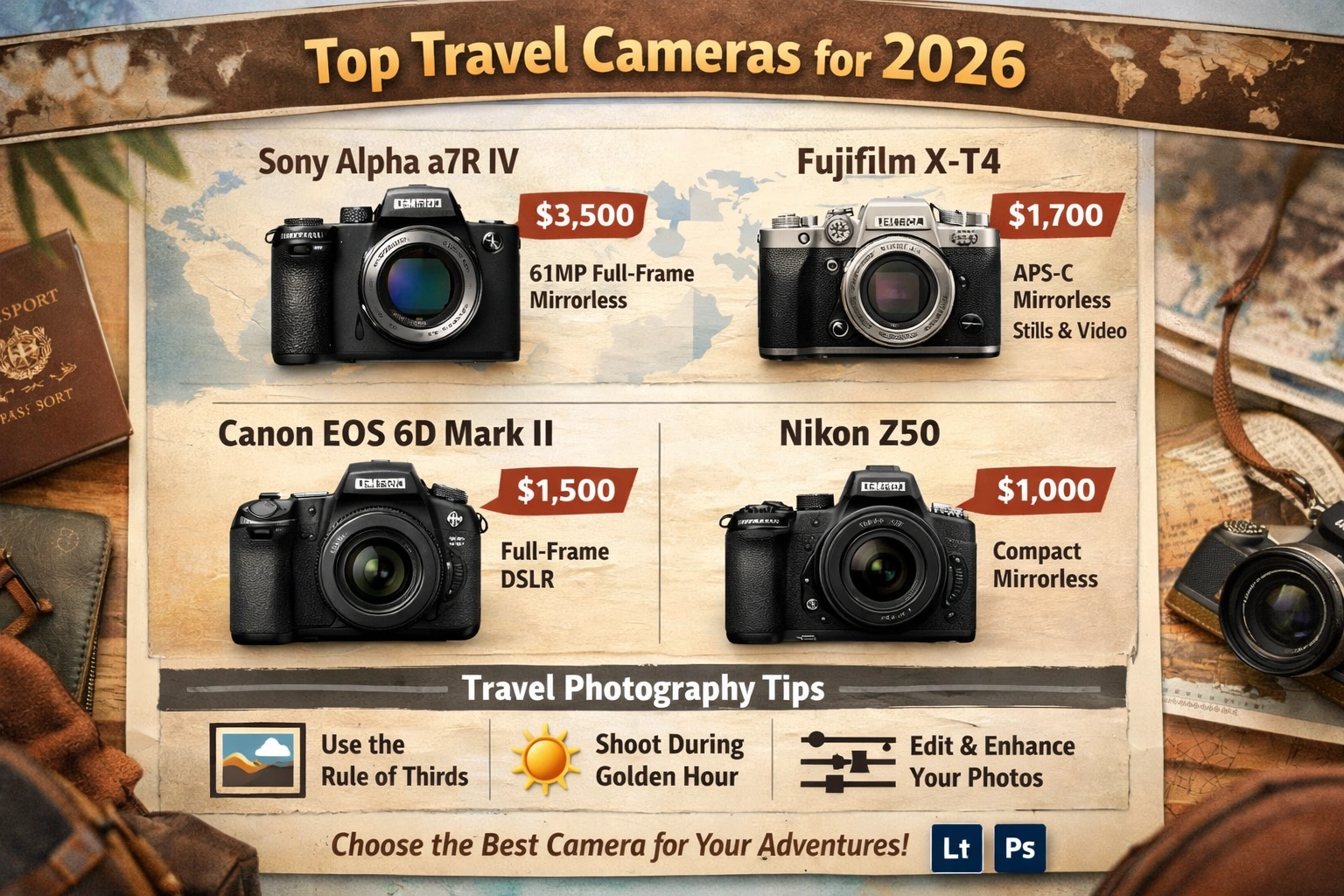 Based on our research and testing, here are some of the top travel cameras for 2026. The Sony Alpha a7R IV is a high-end mirrorless camera that offers excellent image quality and manual controls, with a price tag of around $3,500. The Fujifilm X-T4 is a versatile mirrorless camera that's great for both stills and video, with a price tag of around $1,700. The Canon EOS 6D Mark II is a full-frame DSLR camera that offers excellent image quality and manual controls, with a price tag of around $1,500. The Nikon Z50 is a compact mirrorless camera that's great for travel and street photography, with a price tag of around $1,000. When choosing a travel camera, be sure to research and compare different models to find the one that best fits your needs and budget. Consider factors such as image quality, portability, and features, and read reviews from other photographers to get a sense of how the camera performs in real-world use.