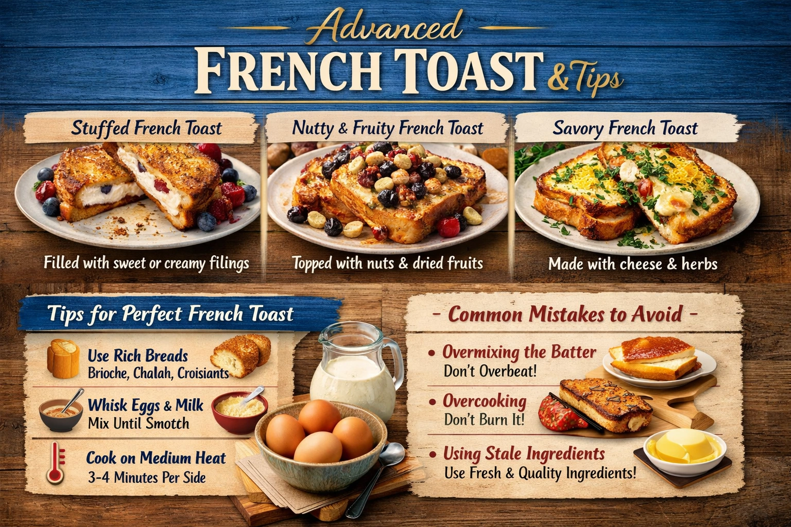 So, what are some common mistakes to avoid when making French toast? I think one of the biggest mistakes is overmixing the egg and milk mixture. You want to whisk the eggs and milk together just until they're smooth and creamy, with no lumps or bubbles. Overmixing can result in a tough, dense French toast that's not very appetizing. Another mistake is overcooking the French toast. You want to cook it over medium heat for about 3-4 minutes on each side, or until it's golden brown and crispy. Overcooking can result in a dry, burnt French toast that's not very tasty. Not using fresh ingredients is another mistake to avoid. You want to use fresh, high-quality ingredients, such as farm-fresh eggs and whole milk, to ensure that your French toast is rich, creamy, and delicious. I think it's also helpful to use a thermometer to ensure that the pan is at the right temperature, as this will help the French toast to cook evenly and prevent it from burning.Key Takeaways