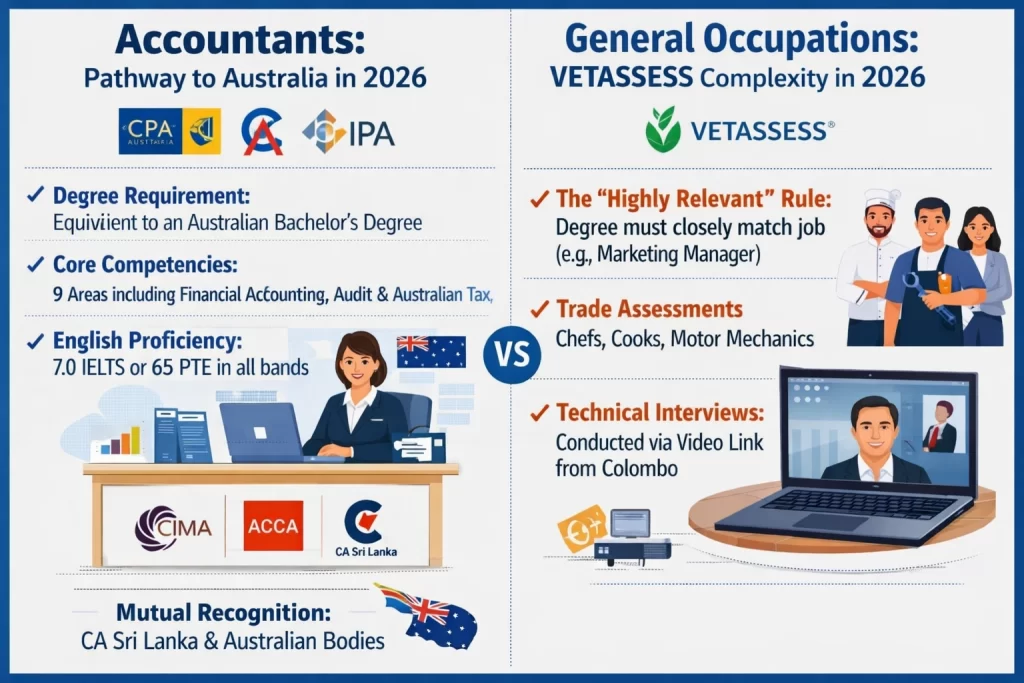 Accountants are assessed by CPA Australia, CA ANZ, or IPA. In 2026, the mutual recognition between CA Sri Lanka and Australian bodies remains a powerful tool.