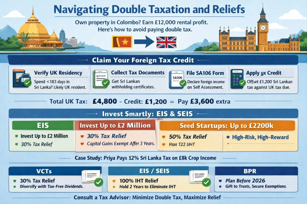 Take Priya, a London-based doctor with £500,000 in Colombo rentals. She spots a qualifying UK fintech via Growth Capital Ventures. In 2025, she subscribes £40,000 to an SEIS fund. HMRC refunds £20,000 income tax. Hold two years for BPR—IHT drops to zero on death. Her Sri Lankan assets stay separate, but UK-Sri Lanka treaty avoids double tax on gains[Blacktower Financial Management].