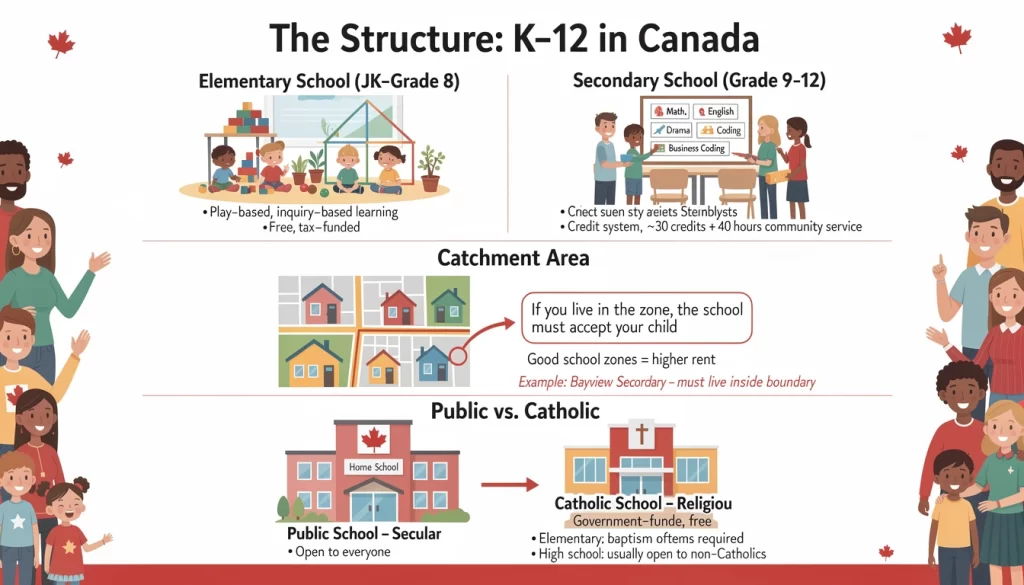 Real World Example: If you want your child to attend a top-rated high school like Bayview Secondary in Toronto, you cannot just apply. You must rent or buy a home within that school's specific boundary lines. This makes rent in "good school zones" significantly more expensive.