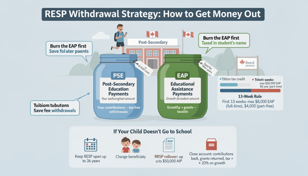The golden rule of RESP withdrawals is to drain the taxable money (EAP) first. Why? Because the EAP is taxed in the student's name, not yours.