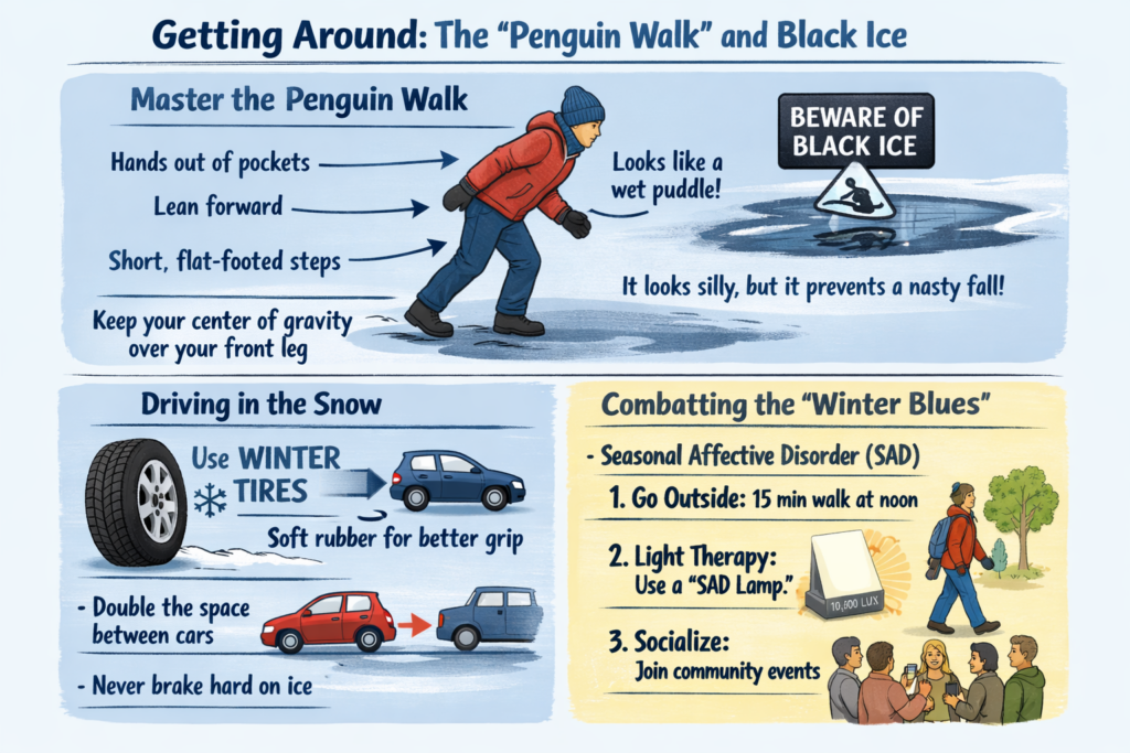 Walking on snow is easy; walking on ice is dangerous. You will inevitably encounter "black ice"—a thin, invisible layer of ice on the pavement that looks like a wet puddle.