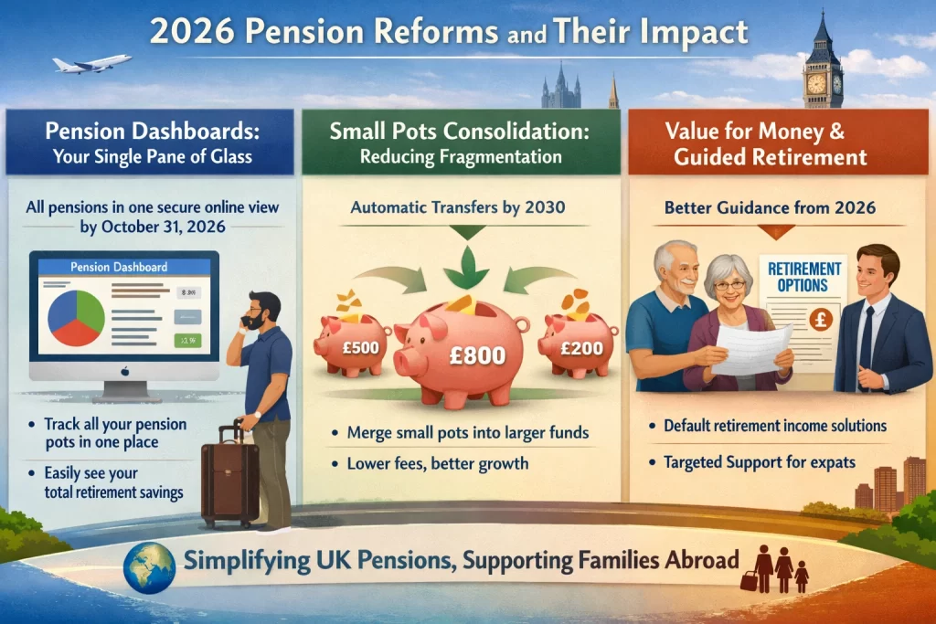2026 marks a watershed moment for UK pension savers. Three major reforms are reshaping how you track, consolidate, and grow your retirement savings—changes that matter especially if you’re managing pensions while supporting family abroad.