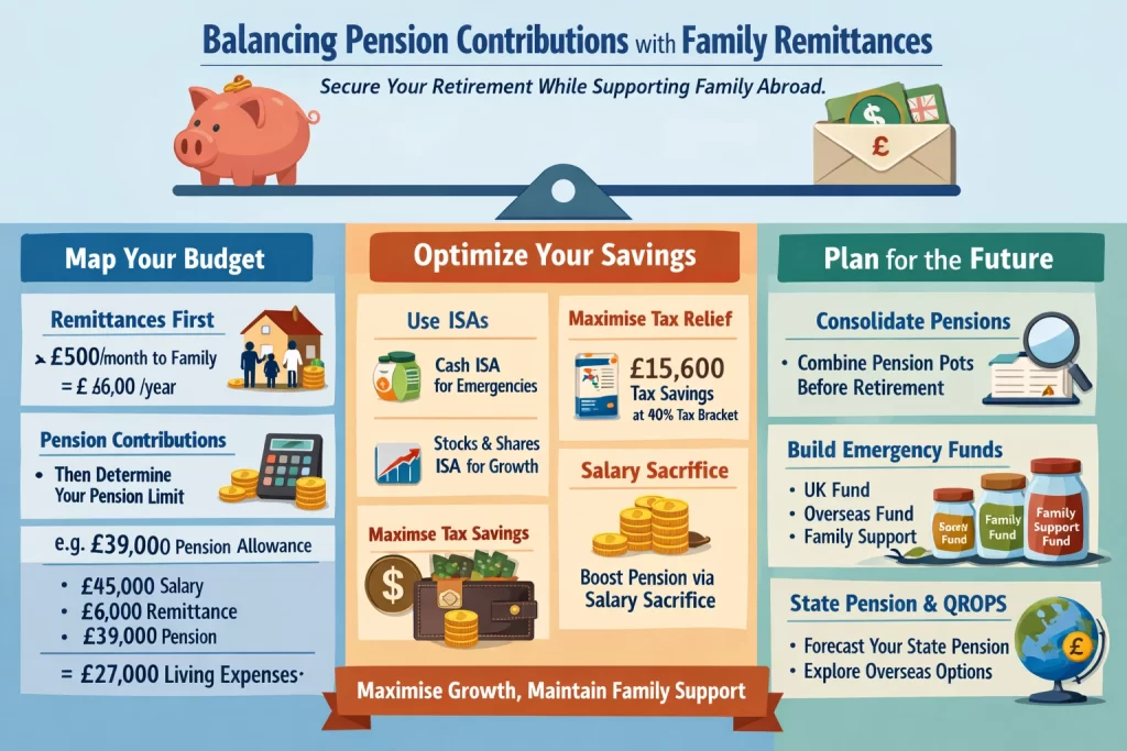 Consider using a tax-efficient ISA alongside your pension. While pensions give you upfront tax relief, ISAs offer flexibility—you can access funds if family emergencies arise without penalties. A balanced approach: max your pension contributions up to what your employer matches (usually 3-5%), then direct surplus income to a Cash ISA for remittances and a Stocks and Shares ISA for medium-term growth.