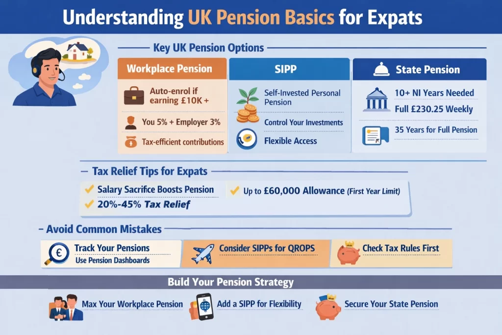 As someone who’s guided hundreds of expats through UK pension setups over 15 years, I see you juggling contributions here while wiring cash home. Start with the big three: workplace pensions, SIPPs, and State Pension. Workplace schemes kick in via auto-enrolment if your UK earnings top £10,000 yearly—you join automatically unless you opt out. Employers match your contributions, often 3% minimum on qualifying earnings between £6,240 and £50,270 for 2025/26. SIPPs give you control over investments, from global stocks to property funds, perfect if you’re eyeing family support flexibility. State Pension needs 10 qualifying National Insurance (NI) years minimum, 35 for the full £230.25 weekly (2024/25 rate).[2][3]