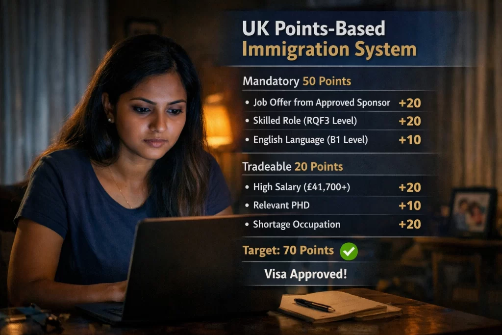 Score 70 points total: 20 for the sponsor job, 20 for skill level, 10 for English, 20 from salary or perks. Miss one? Application tanks. From my desk, watching Sri Lankans thrive, I say: match your skills to the list first, then hunt sponsors via LinkedIn or gov.uk directories. Your story could be next.