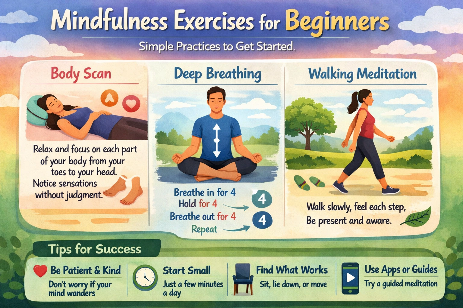 There are many mindfulness exercises that you can try, but here are a few that are perfect for beginners. One of the most popular mindfulness exercises is the body scan. This involves lying down or sitting comfortably, and bringing your attention to different parts of your body, starting at your toes and working your way up to the top of your head. As you focus on each area, notice any sensations, feelings, or thoughts without judgment. Another great exercise for beginners is deep breathing. This involves focusing your attention on your breath, feeling the sensation of the air moving in and out of your body, and letting go of any thoughts or distractions. You can try inhaling for a count of four, holding your breath for a count of four, and exhaling for a count of four, repeating the cycle several times. This can help calm your mind, slow down your heart rate, and reduce stress and anxiety. Walking meditation is another excellent exercise for beginners. This involves paying attention to your feet touching the ground, the sensation of your legs moving, and the rhythm of your breath. You can try walking slowly and deliberately, focusing on the sensation of each step, and letting go of any thoughts or distractions. This can help you cultivate greater awareness, balance, and coordination, and reduce stress and anxiety. Remember, the key to mindfulness practice is to be gentle and kind to yourself. Don't worry if your mind wanders or you feel distracted – simply acknowledge the thought, and gently bring your attention back to the present moment. With regular practice, you'll become more comfortable with the exercises, and you'll start to notice the benefits of mindfulness in your daily life. You can also try guided meditation apps, videos, or classes to help you get started and stay on track.