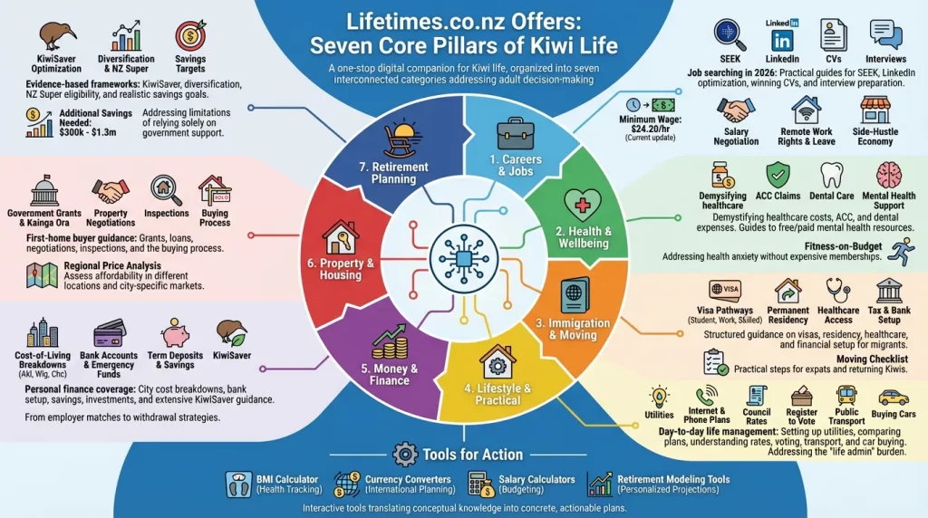 Lifetimes functions as a one-stop digital companion for Kiwi life, organized into seven interconnected categories that address the full spectrum of adult decision-making: