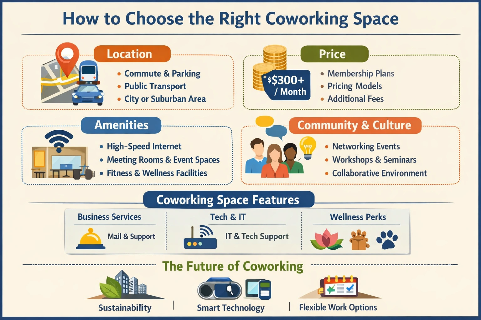 With so many coworking spaces available, it can be difficult to choose the right one for your needs. Here are a few factors to consider: location, price, and amenities. When it comes to location, consider the commute time, parking options, and proximity to public transportation. For example, Spaces, a coworking space provider, offers locations in city centers, near public transportation hubs, and in suburban areas. Price is another important factor, as coworking spaces can vary significantly in terms of cost. Consider the membership plans, pricing models, and any additional fees or services. For example, WeWork offers a range of membership plans, including part-time, full-time, and virtual memberships, with prices starting at $300 per month. Amenities are also a key consideration, as they can enhance your productivity, comfort, and overall work experience. Consider the types of amenities offered, such as high-speed internet, meeting rooms, and event spaces. For example, The Assembly, a coworking space in San Francisco, offers a range of amenities, including high-speed internet, meeting rooms, and event spaces, as well as a rooftop deck and a fitness center. In addition to these factors, it's also important to consider the community and culture of the coworking space. Look for spaces that align with your values, interests, and work style, and that offer opportunities for socialization, networking, and professional development. For example, The Wing offers a range of events and activities, including workshops, seminars, and social gatherings, all of which are designed to support the personal and professional growth of its members.