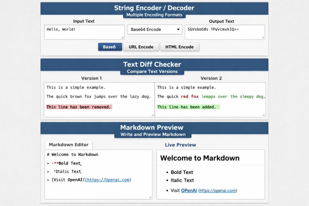Encode sensitive data with the String Encoder for safe transmission. Compare code changes with the Text Diff Checker before deployment. Generate placeholder content with Lorem Ipsum for testing interfaces.
