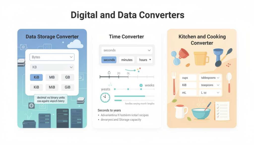 The Data Storage Converter is essential for anyone working with digital files and storage. The tool handles both decimal (KB, MB, GB) and binary (KiB, MiB, GiB) units, which differ in their base calculations.