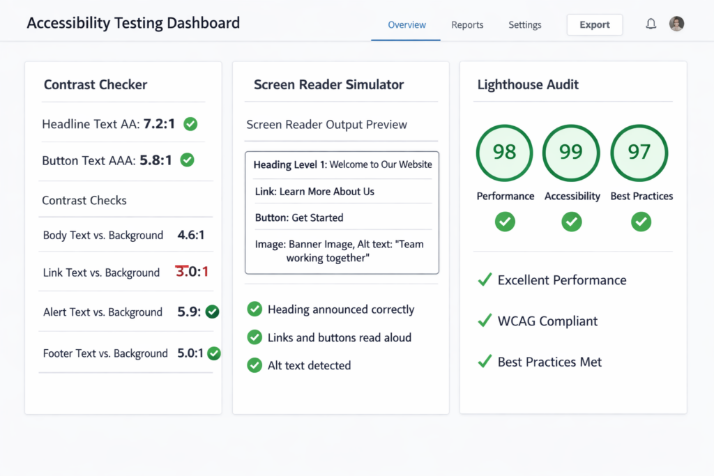 - Contrast and readability: 4.5:1 ratios for text, large tappable links (48px+), and clear focus states for keyboard navigation.diligentic+1