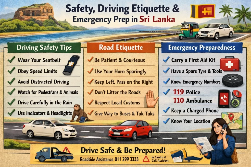 - Kandy – Colombo A1 has heavy traffic, buses and frequent junctions; drive defensively and avoid peak hours.