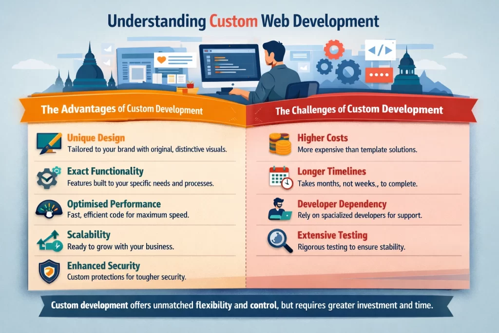 Custom development makes most sense when you have genuine requirements that templates cannot satisfy, sufficient budget to invest in quality custom work, timeline flexibility to allow proper development, and a plan for ongoing development resources.