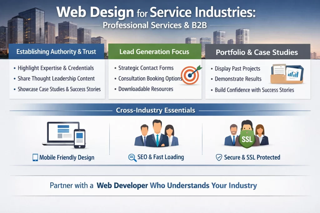 Service providers sell expertise. Their websites must communicate competence, professionalism, and trustworthiness. This means clean, professional design (nothing that looks cheap or amateur), clear articulation of services and expertise, and credentials that demonstrate qualification.