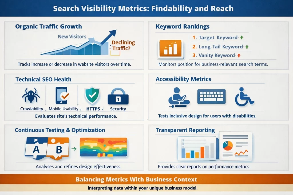 Keyword rankings track visibility for specific search terms relevant to your business. Ranking improvements for target keywords indicate effective optimization. However, focusing exclusively on vanity keywords that lack commercial intent may produce traffic without business value. Quality search optimization targets terms that attract visitors likely to convert, not merely those generating highest volumes.